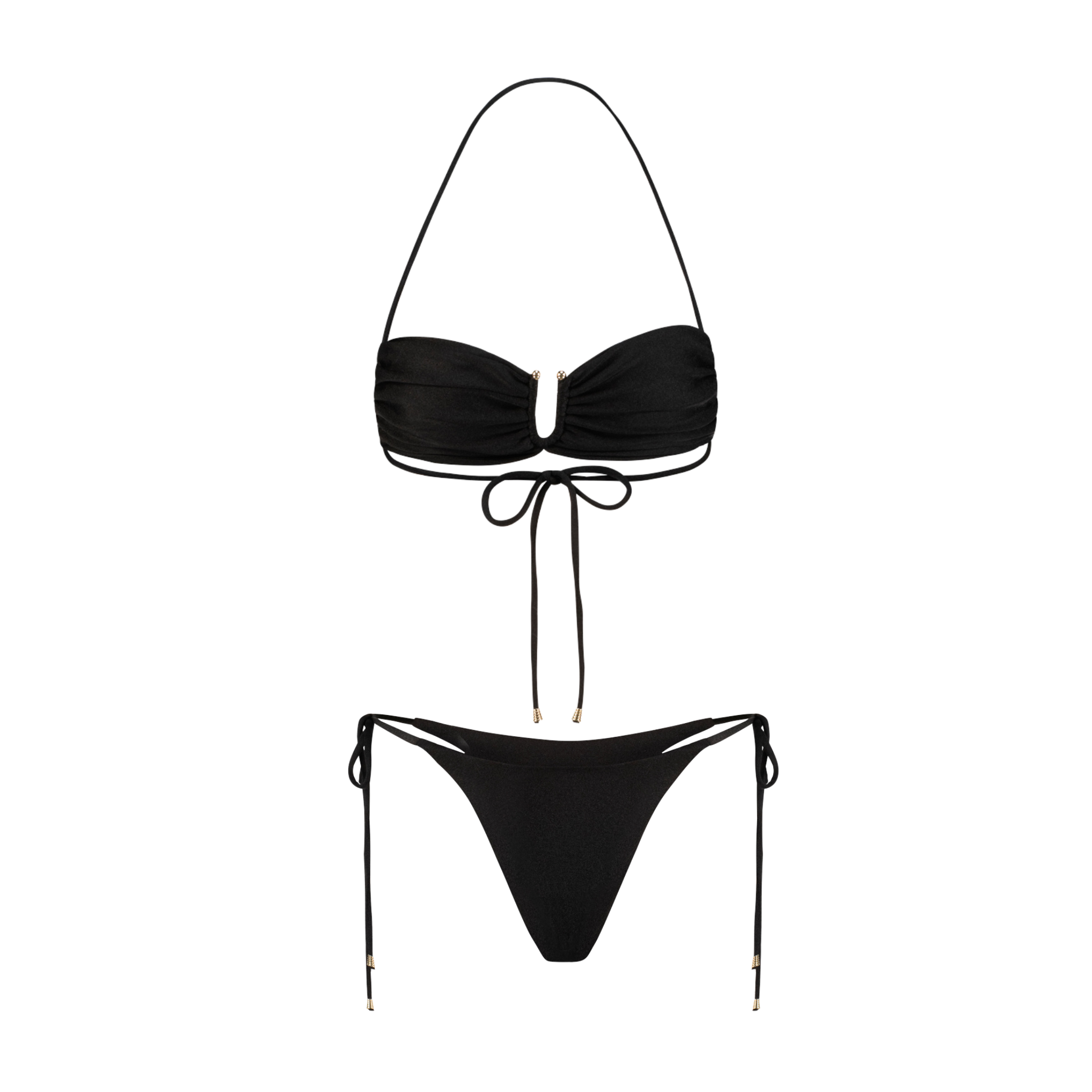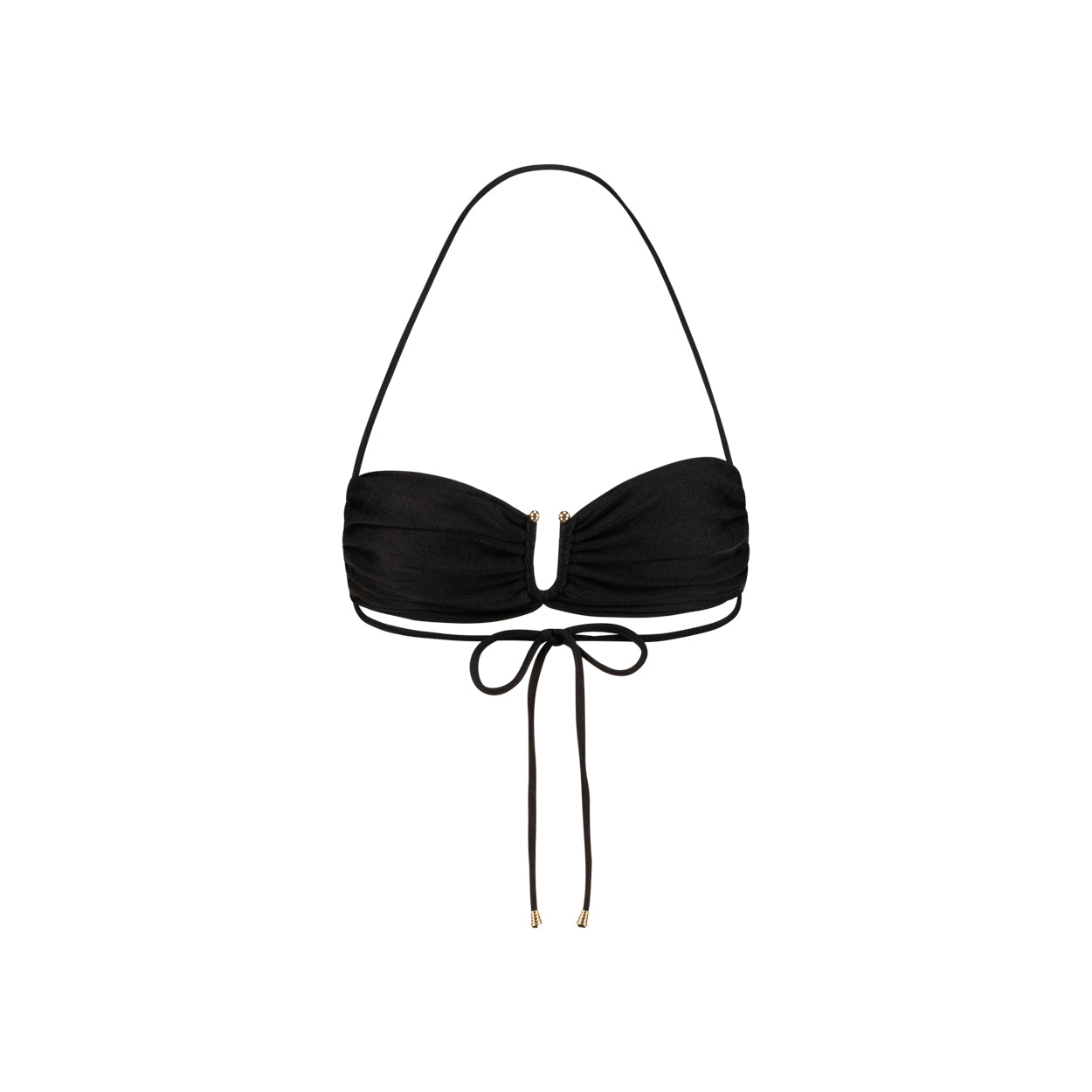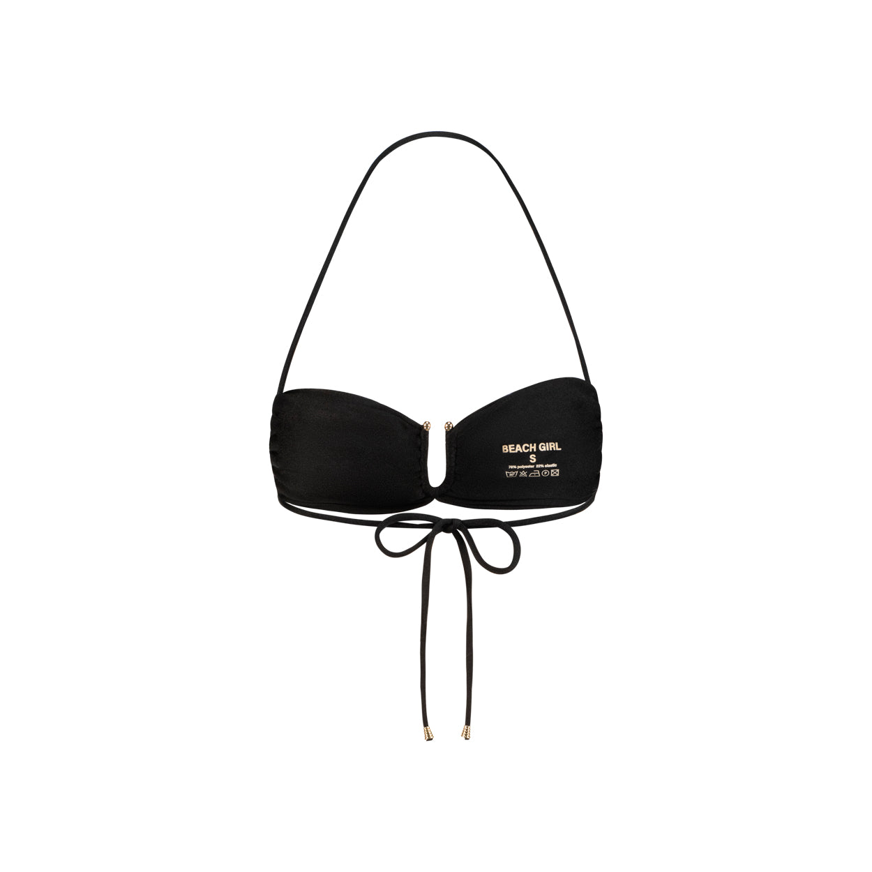 Black top with gold tone U-shape hardware with self tie. No removable cups.