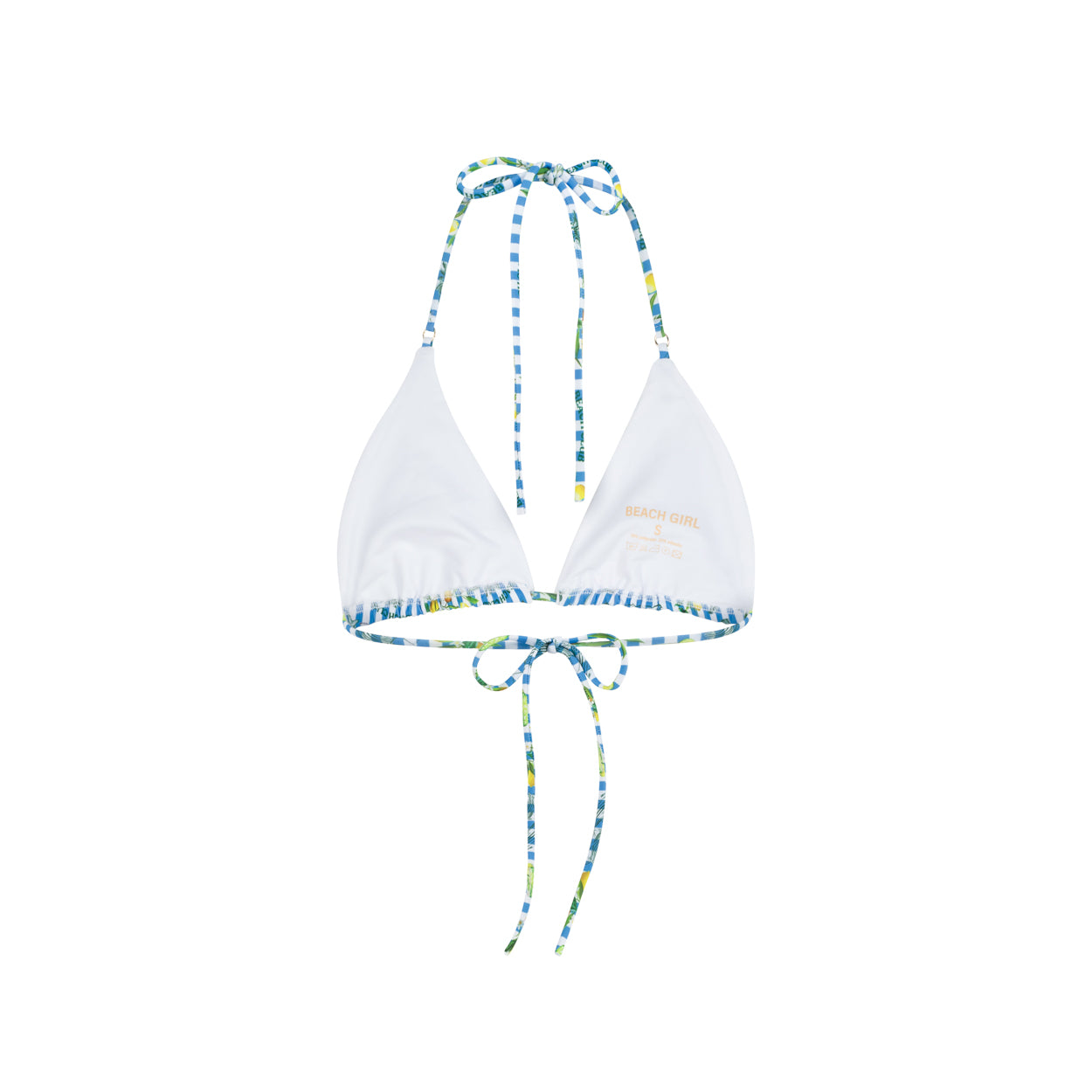 Our exclusive blue strips and lemon prints on a classic tie triangle pattern. No removable cups.