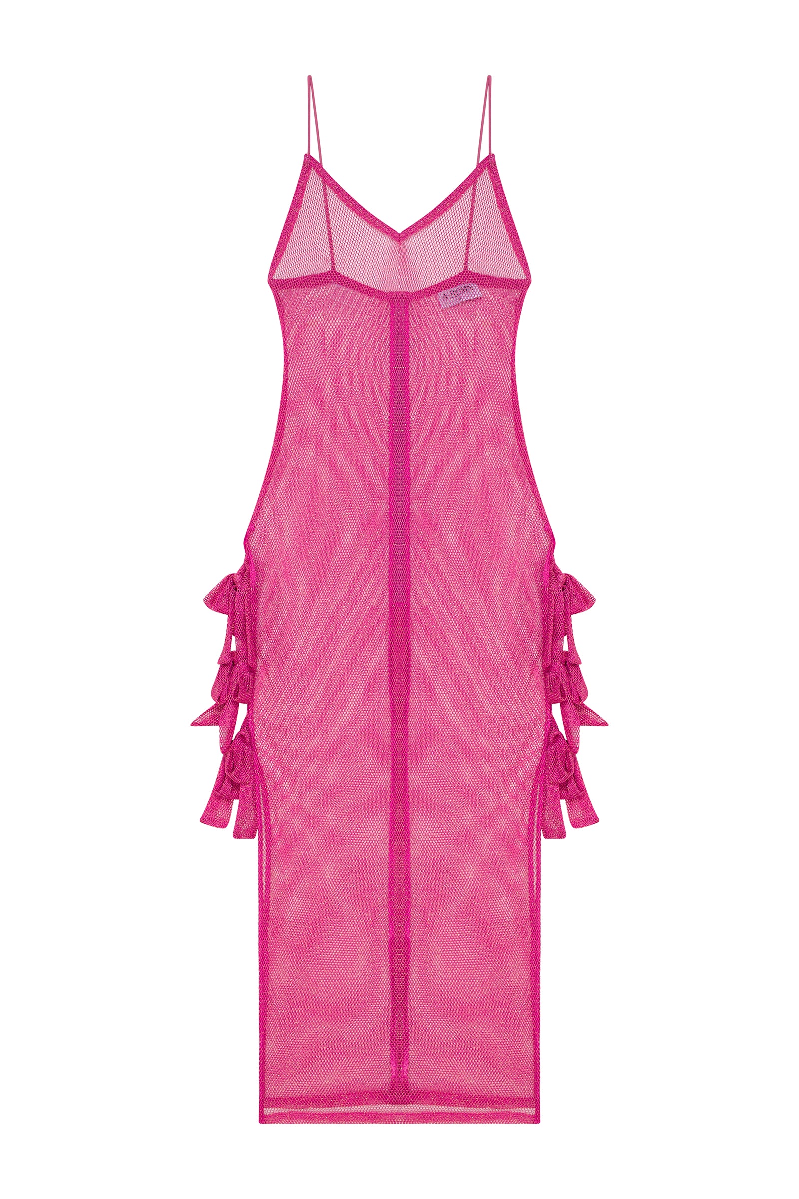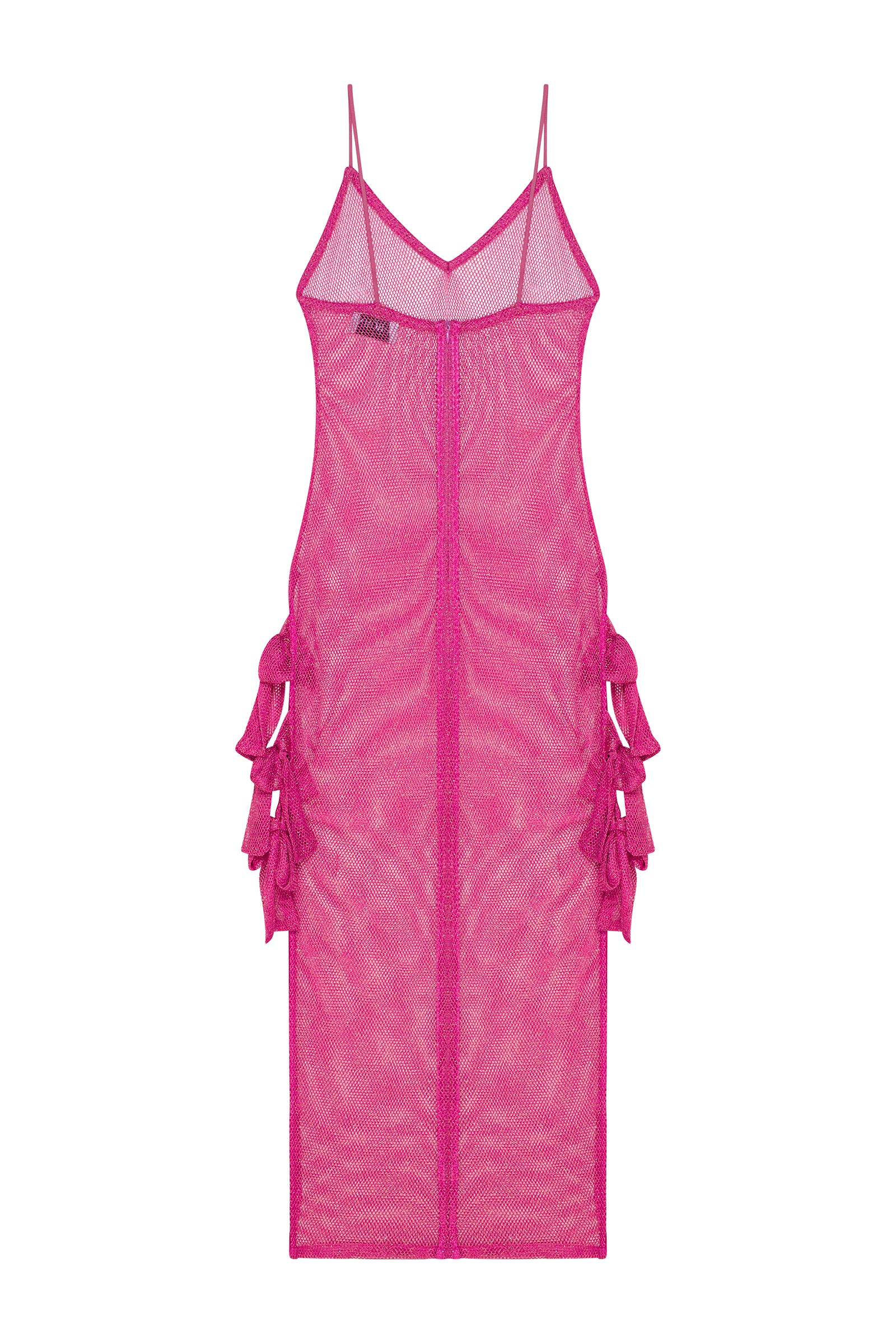 Glamorous look in a long beach dress, net fabric side bow-tie detailed, hidden back zipper, small straps in pink margarita color.