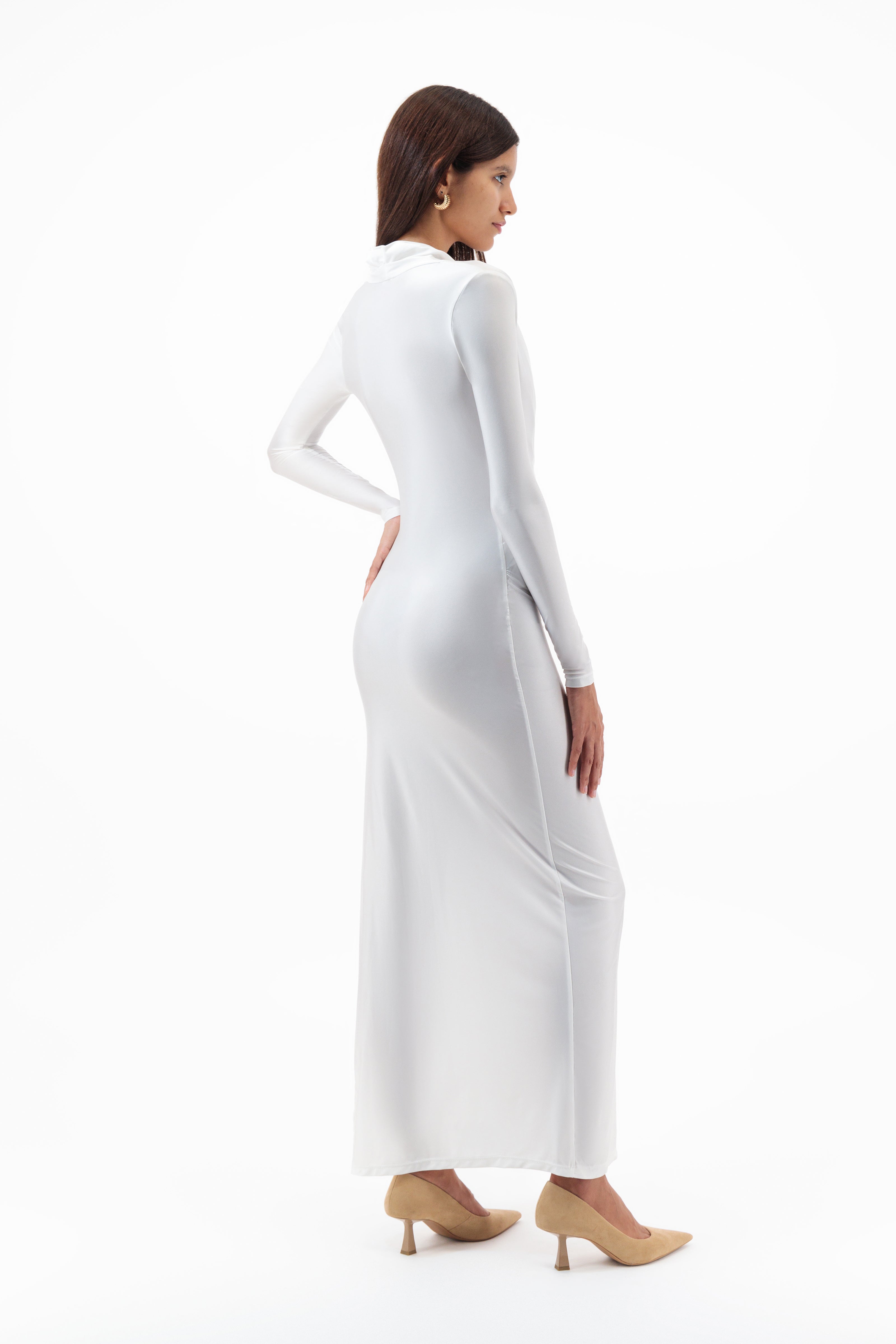 A gorgeous maxi dress deep cowl neck, long sleeves with gathered detail, high rise slit.