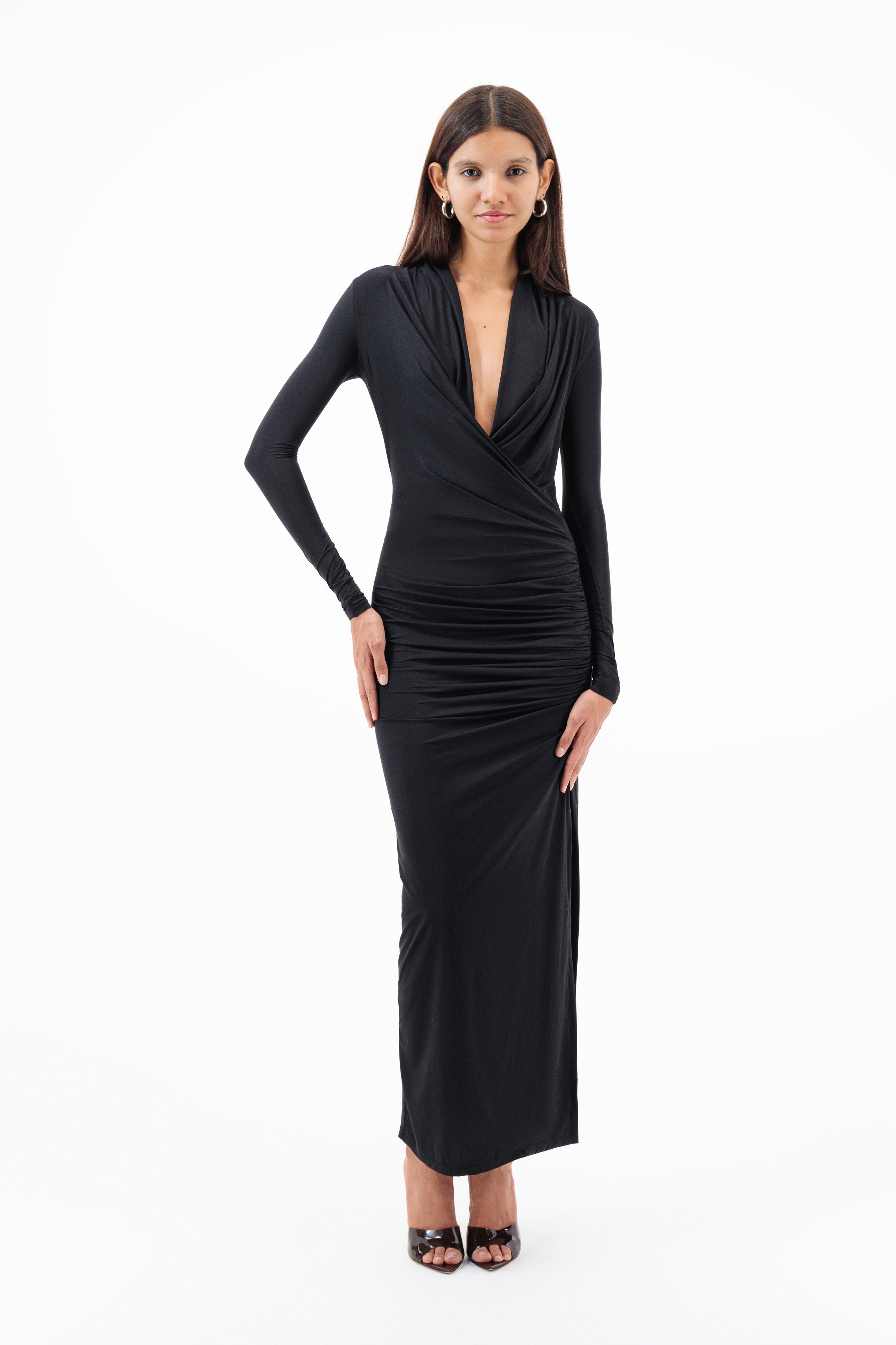 A gorgeous maxi dress deep cowl neck, long sleeves with gathered detail, high rise slit.