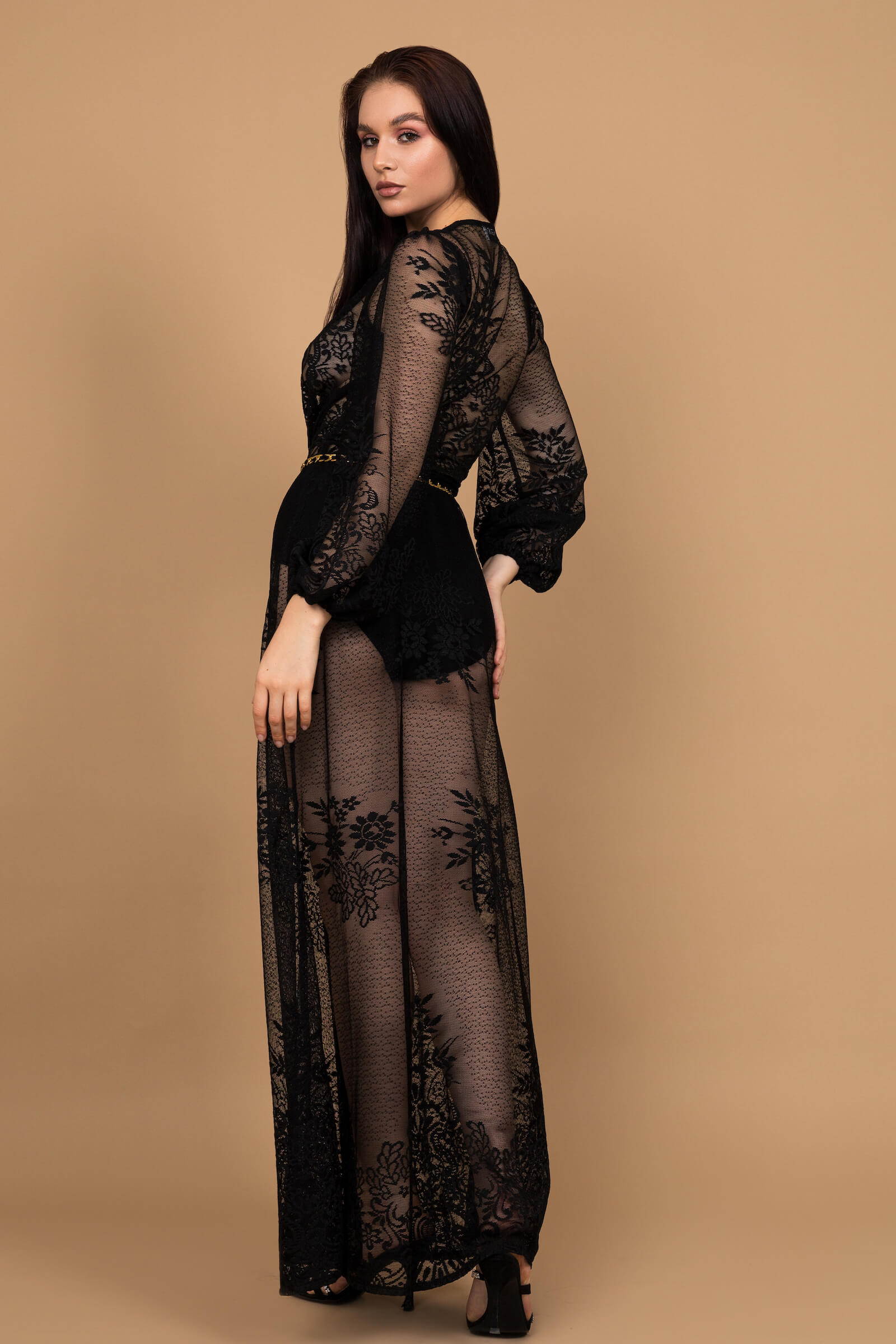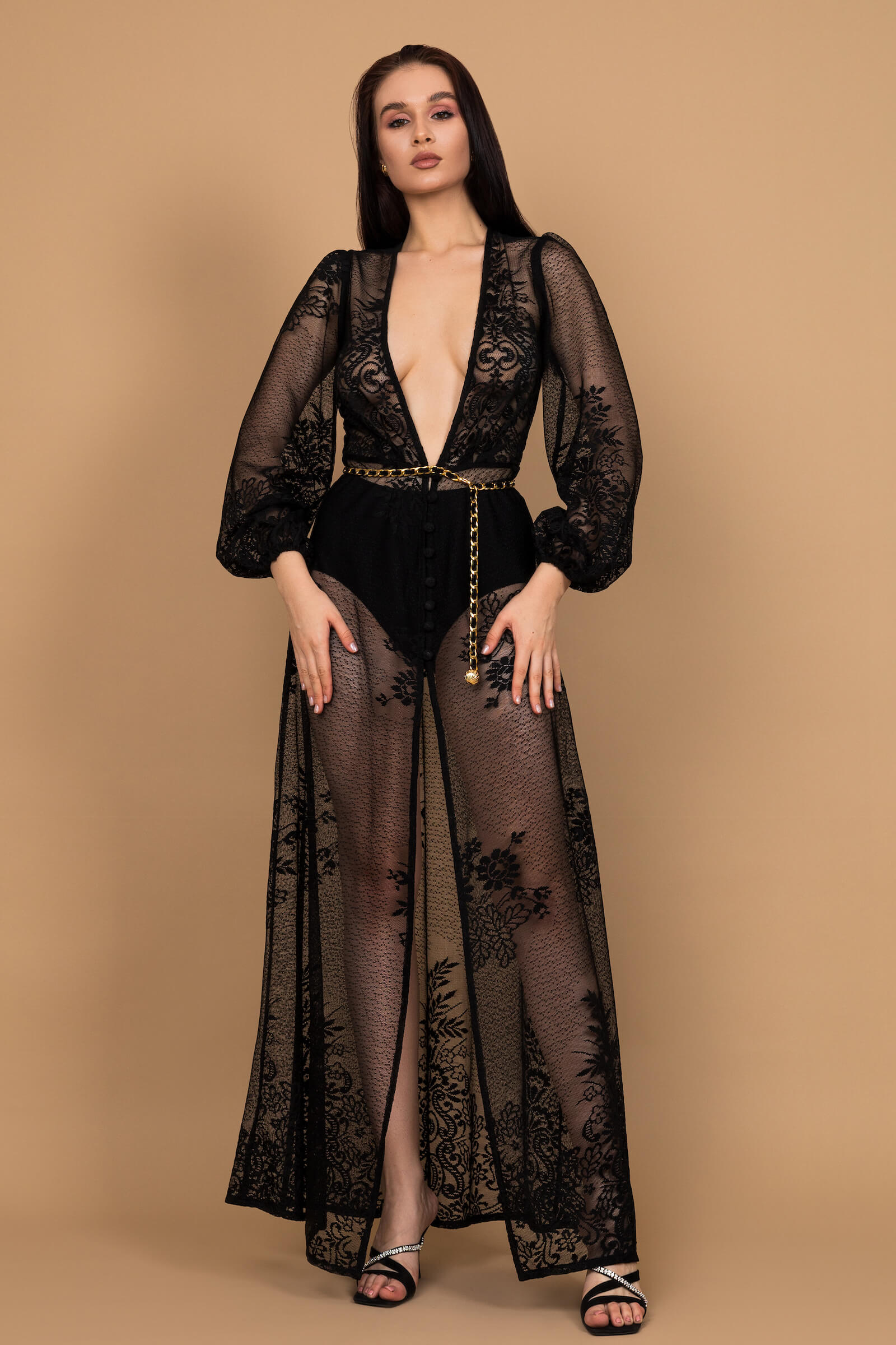 Style your wardrobe with women floral lace beach dress for summer occasions. Deep V neck, long dress opened front with button closure, bishop sleeves and floral woven detailed.