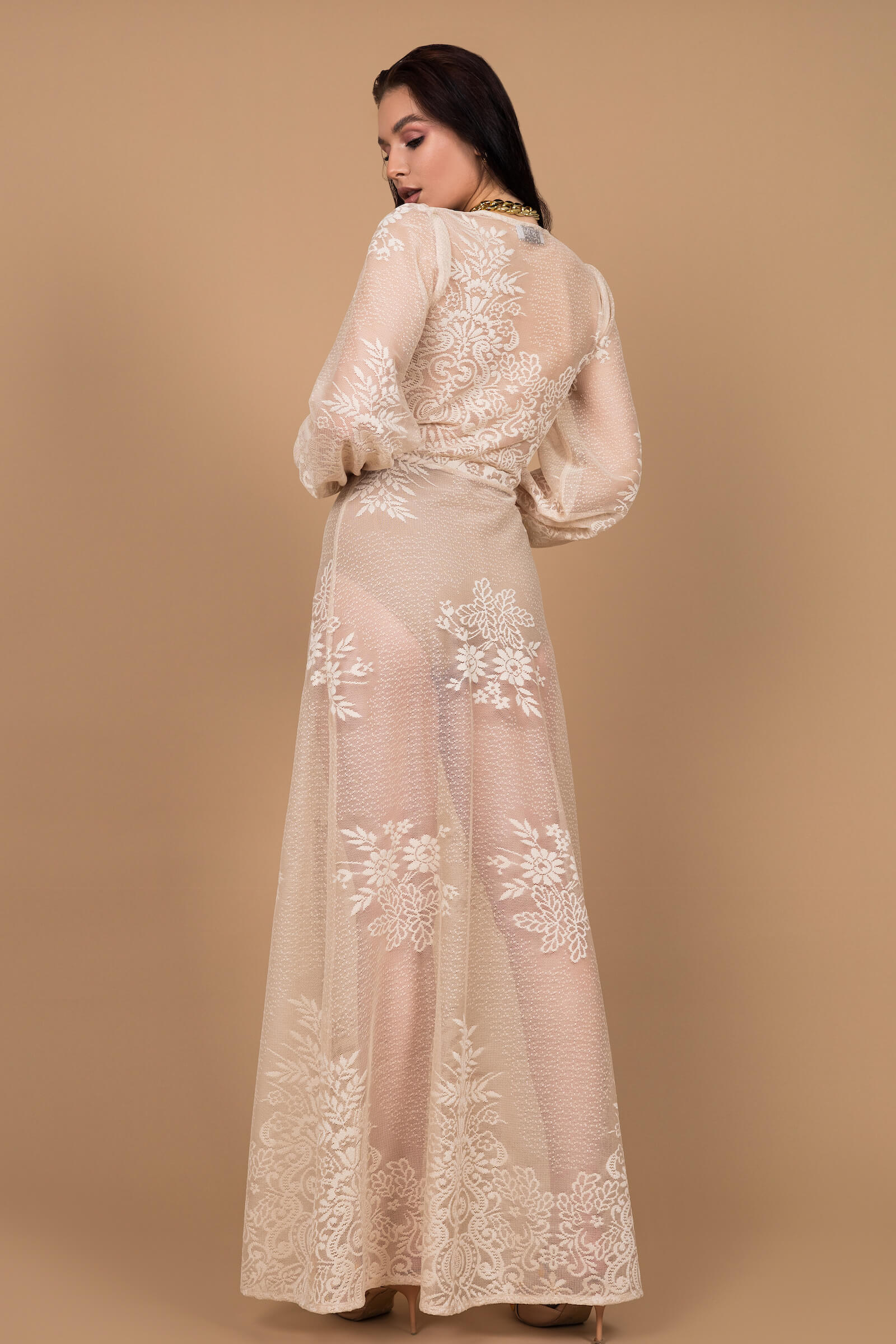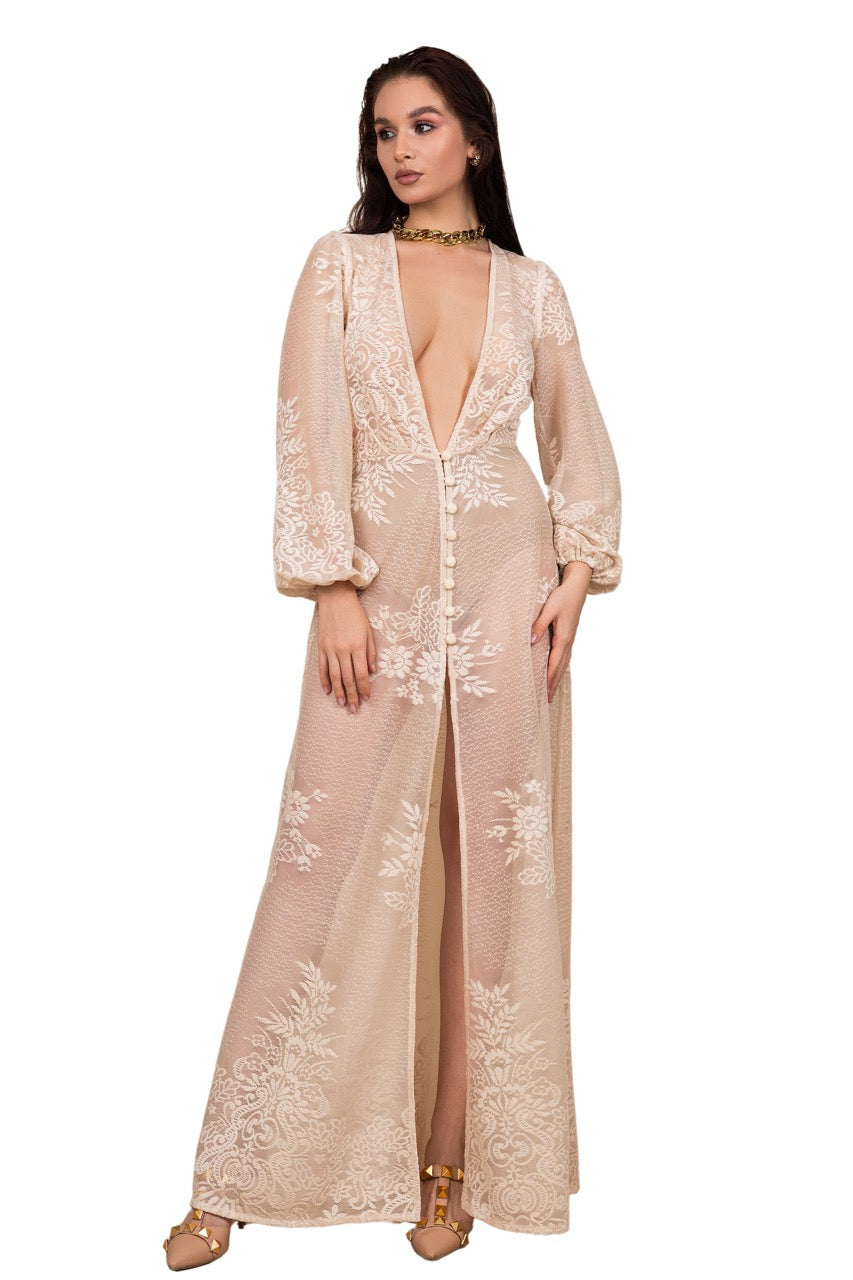 Style your wardrobe with women floral lace beach dress for summer occasions. Deep V neck, long dress opened front with button closure, bishop sleeves and floral woven detailed.