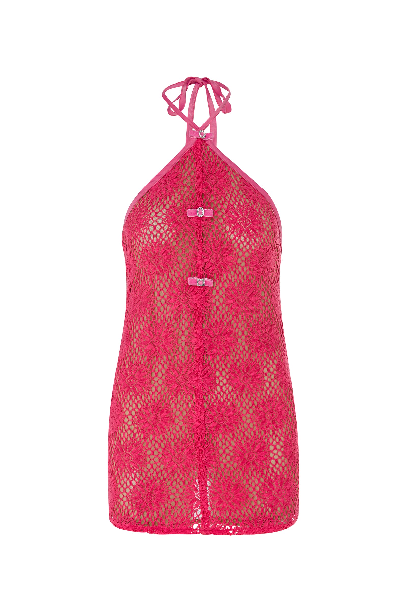 Turn on vacation mode with a mini cocktail dress in crochet knit halter neckline, sleeveless mini dress, open back, fully lined featuring front bowtie details .