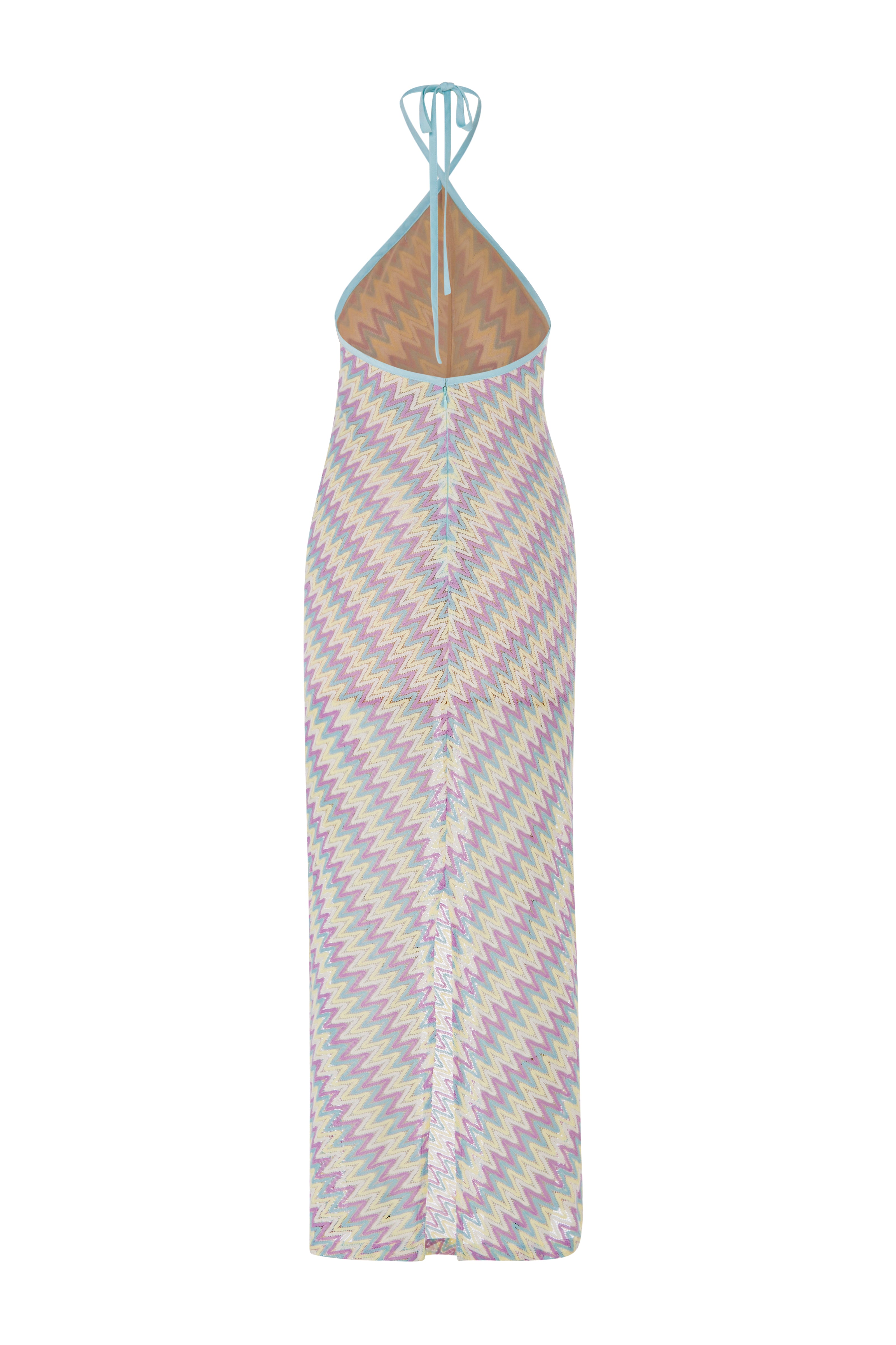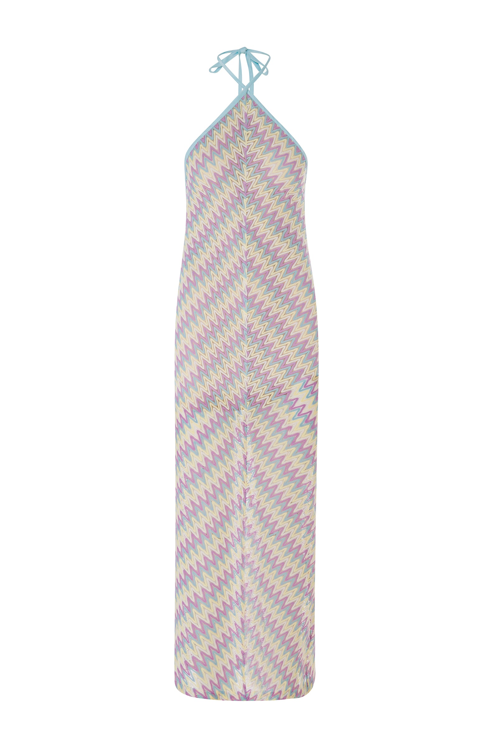 Summer somewhere on vacation list. A cocktail dress in chevron knit halter neckline, sleeveless center back slit full length, open back, partly lined.