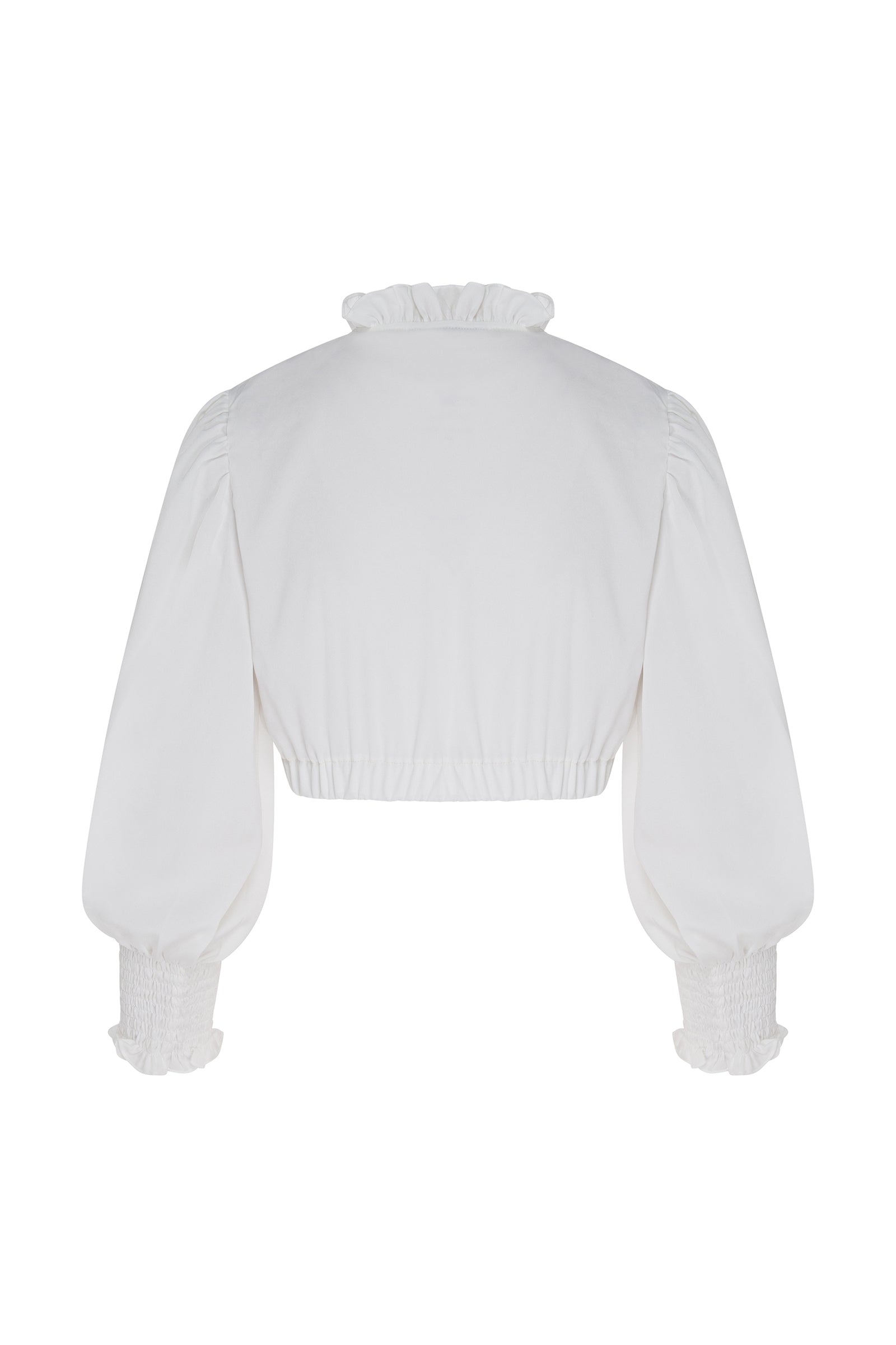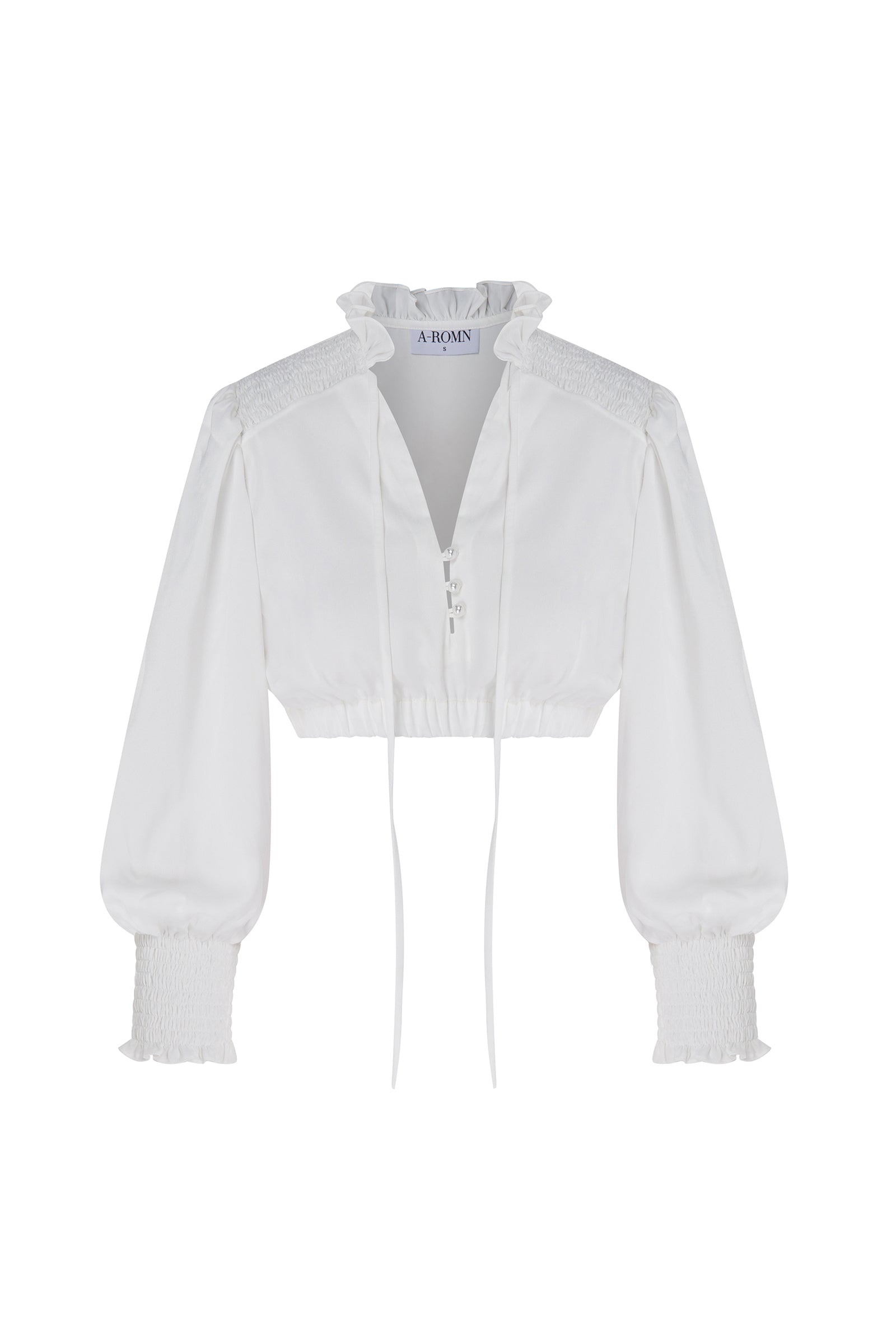 Silk satin crop top with small straps featuring front button closure, smocked shoulders and wrists detailed, elastic hem line.