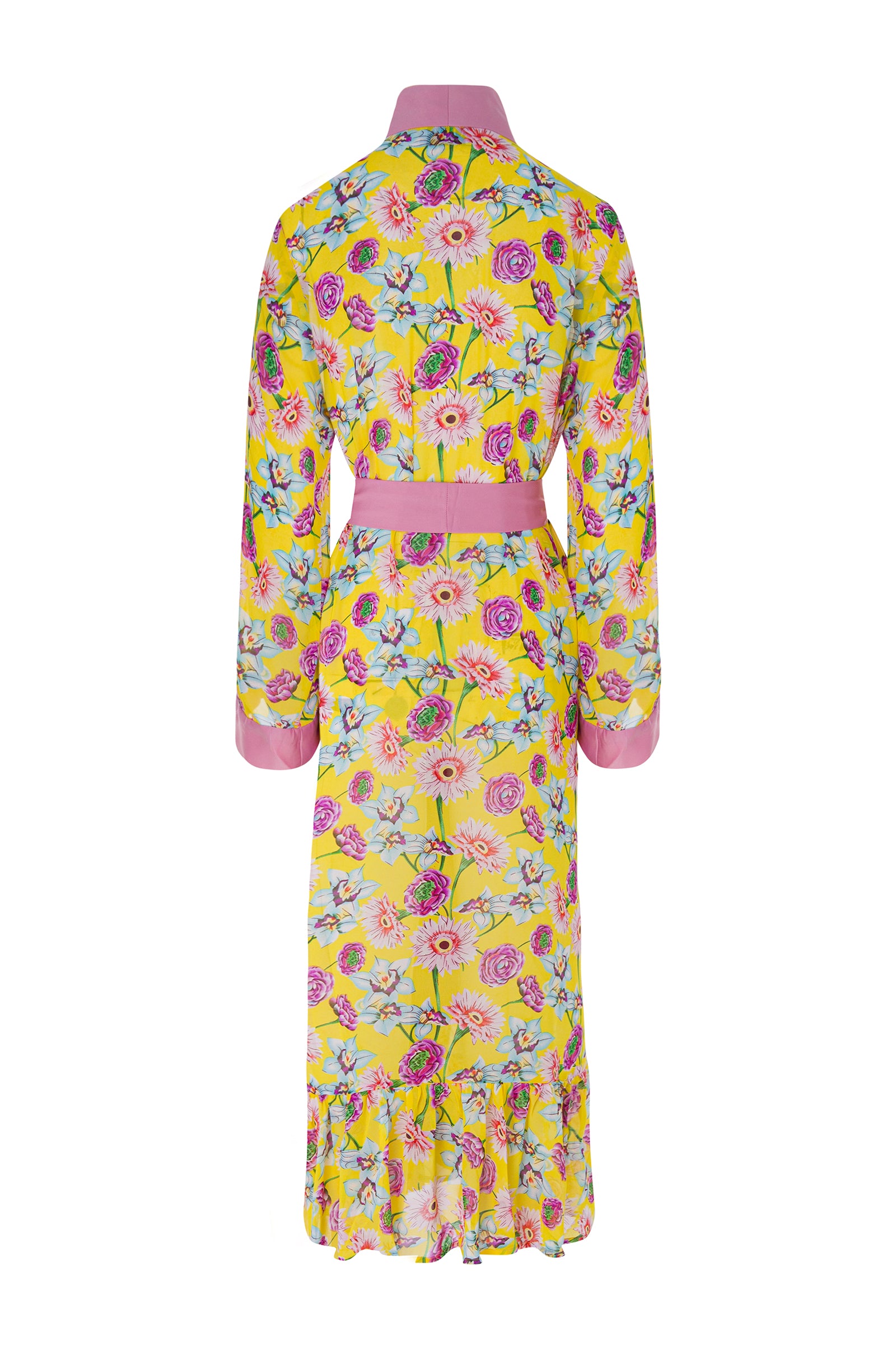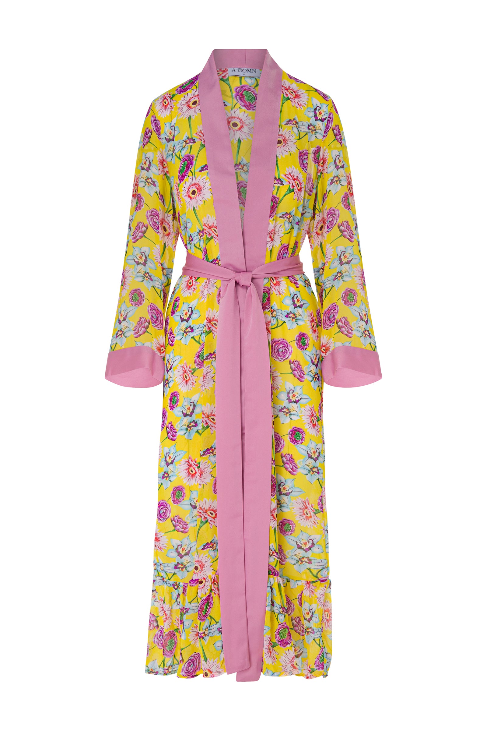 A long dress opened front cover-up. Hems gathered, a tie belted at waist, front tie and long sleeve stylish kimono.