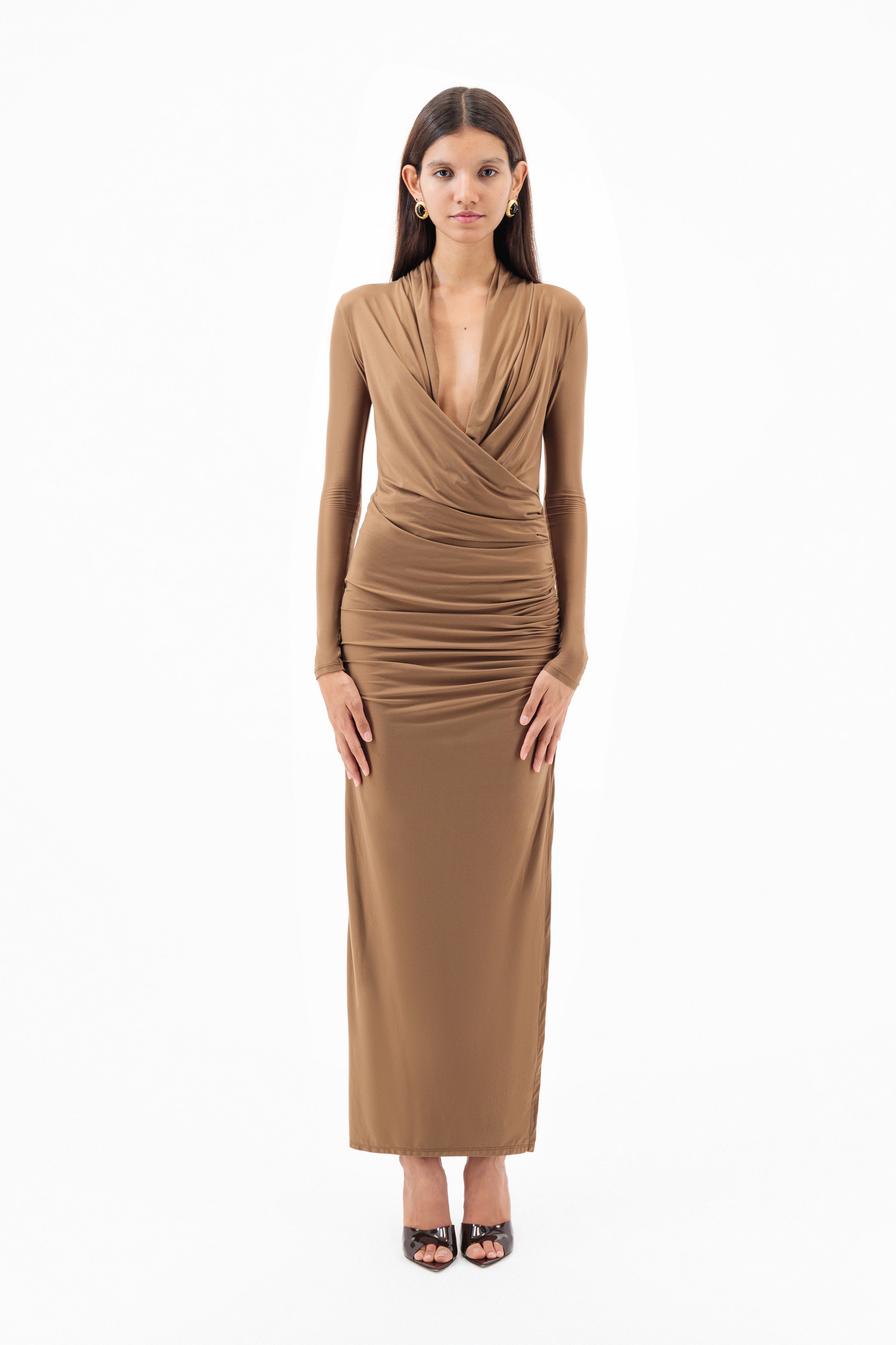 A gorgeous maxi dress deep cowl neck, long sleeves with gathered detail, high rise slit.