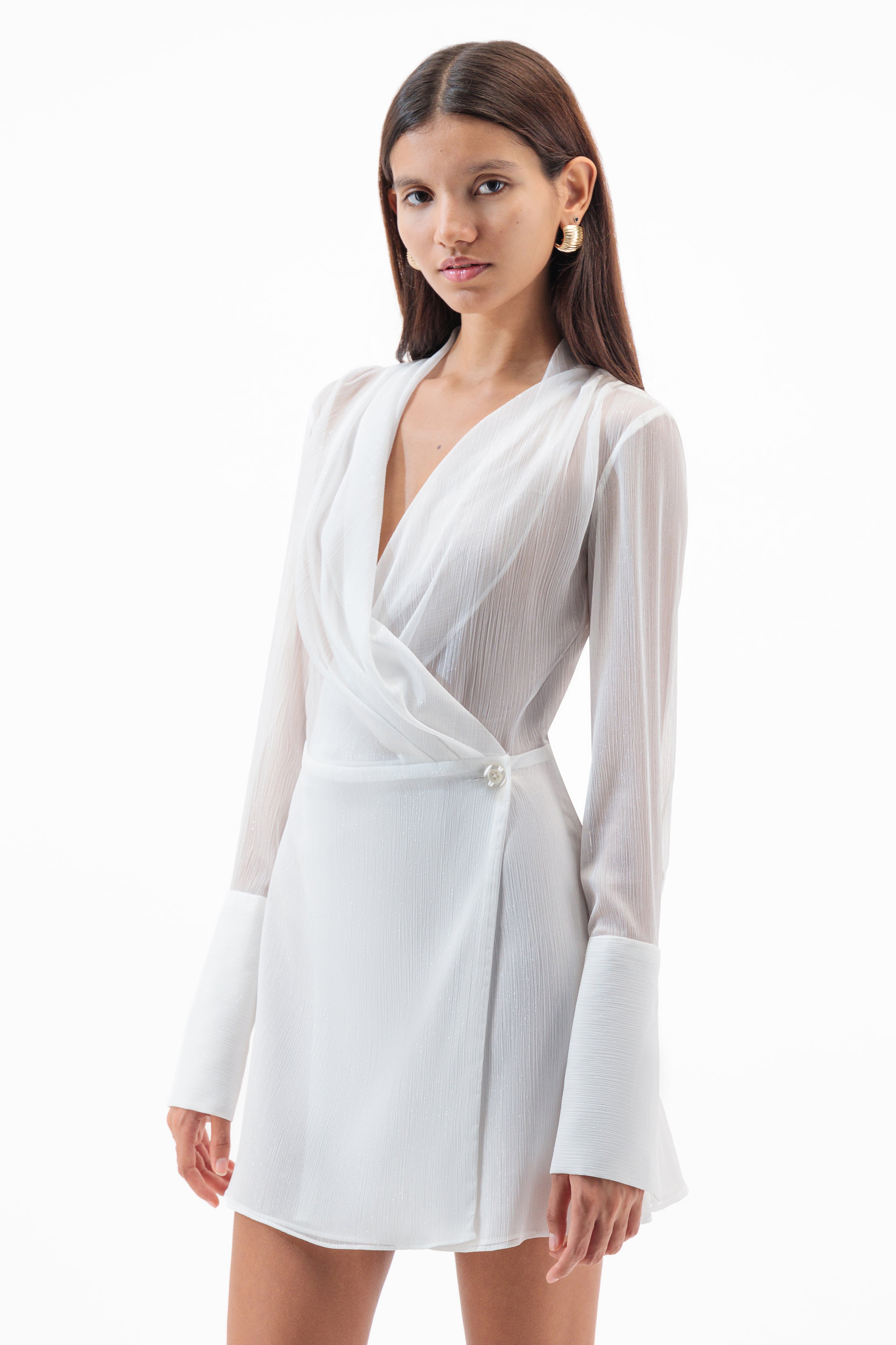 A sharing see through dress deep cowl neck, long sleeves with a button closer, partly lined. Perfect for day look by the beach or party night out.